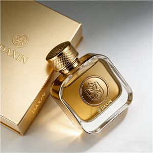 The DAXIN perfume bottle features a striking, embossed shield emblem at its heart, instantly establishing a sense of heritage and prestige.
